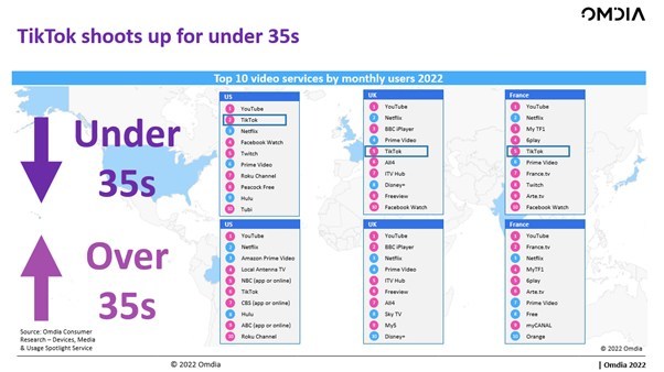 据陈述,在英国和法国,TikTok 的受欢迎程度并不相同,全体排名第五,在英国低于 iPlayer、Netflix 和亚马逊,在法国低于 TF1 服务、Netflix 和 6Play。整体而言,YouTube 仍是这些商场中最受重视的渠道,而关于 35 岁以上人群来说, TikTok 没有进入前十名。