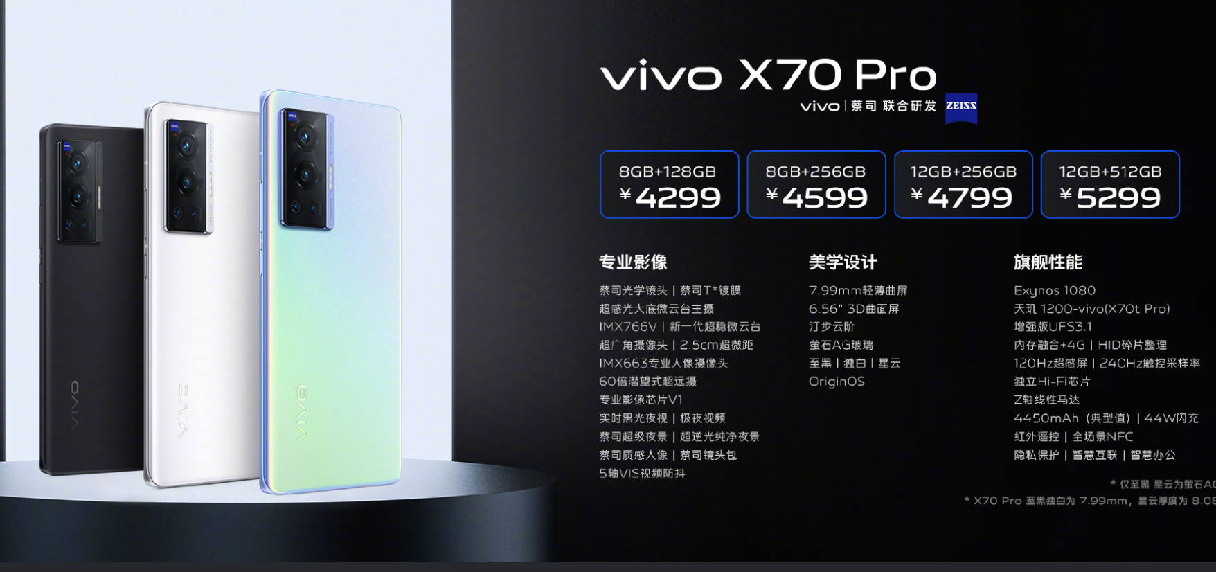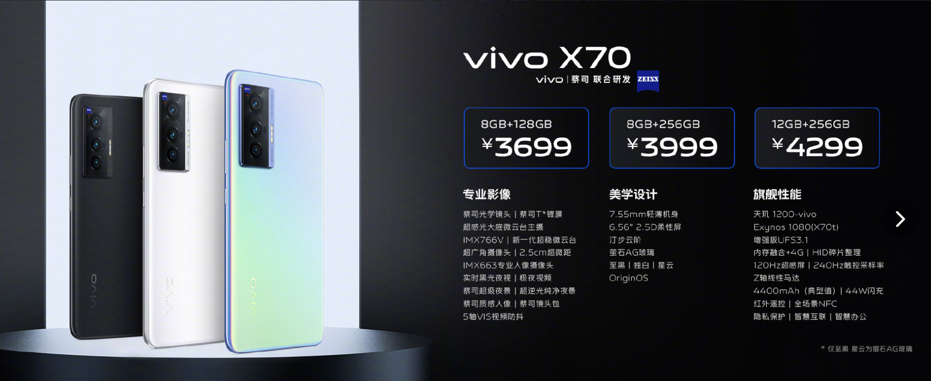 vivo X70系列价格在发布会中发布,vivo X70 Pro 8GB+128G版、8GB+256GB版、12GB+256GB版和12GB+512GB版别价格分别为4299元、4599元、4799元以及5299元;vivo X70 Pro+ 8GB+256GB版、12GB+256GB版和12GB+512GB版别价格分别为5499元、5999元以及6999元;vivo X70价格3699元起。